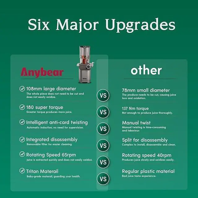 180nm HIGH-TORQUE, 200W Powerful MotorAnybear masticating juicer machine with a high torque of 180nm, ensuring the rotating speed up to 65 RPM, paired with a powerful 200W motor, effortlessly extract juice at low speeds to enhance juice yield up to 98.9%. Minimize oxidation for doubled flavor and freshness.
