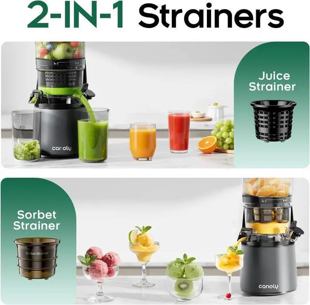 2-IN-1 StrainersIncludes a juice mesh filter (for fresh fruits and vegetables) + sorbet filter (for frozen fruits). This cold press juicer' s Dual-Strainer System adapts to all your needsjuices, sorbets, and more!