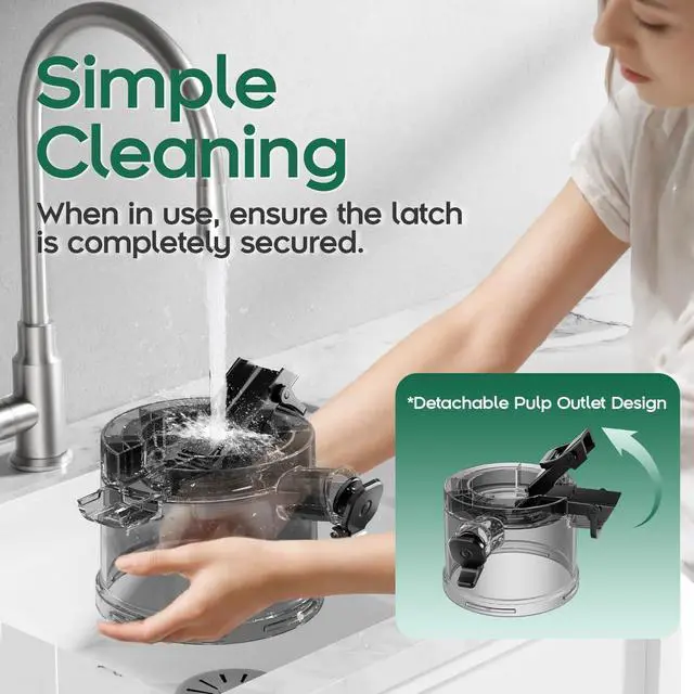 99.6 % High Yield & Easy CleanThis cold press juicer extracts more juice with optimal pulp separation for richer flavor. The detachable pulp container locks securely, making cleanup faster than other juicer machines.