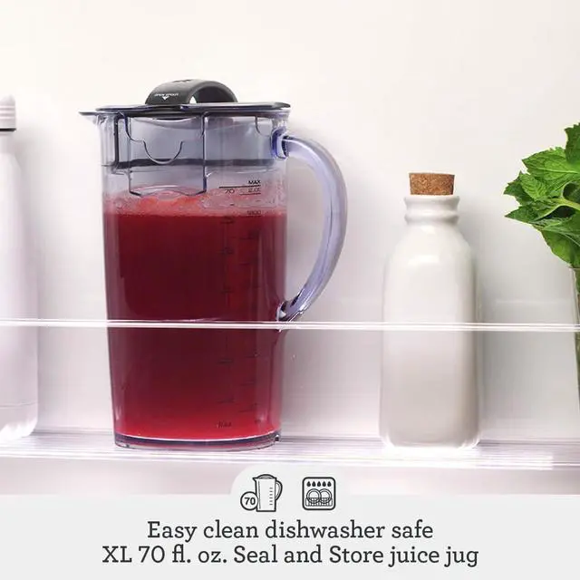 EXTRA LARGE SEAL AND STORE: Interested in juicing a bunch of oranges, apples, or carrots at once? Run your produce through the juicer and seal in a XL 70 fl oz jug; Enough juice for the whole family; Store in the refrigerator for up to three days