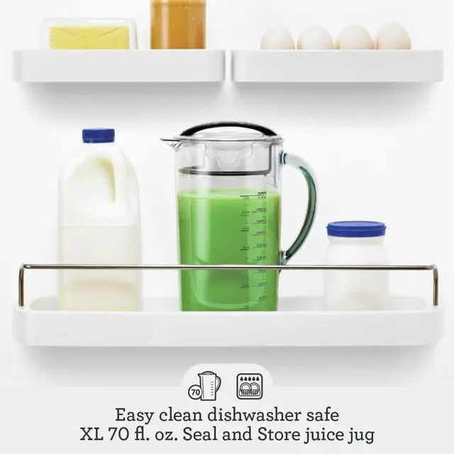 EXTRA LARGE SEAL AND STORE: Interested in juicing a bunch of oranges, apples, or carrots at once? Run your produce through the juicer and seal in a XL 70 fl oz jug; Enough juice for the whole family; Store in the refrigerator for up to three days