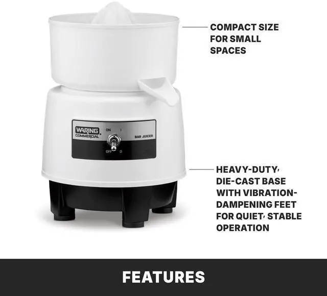 Compact size is ideal for small spaces Heavy duty, die-cast base with vibration-dampening feet for quiet, stable operation Universal reamer thoroughly juices all types of citrus fruits Juice up to 120 oranges per hour ETL