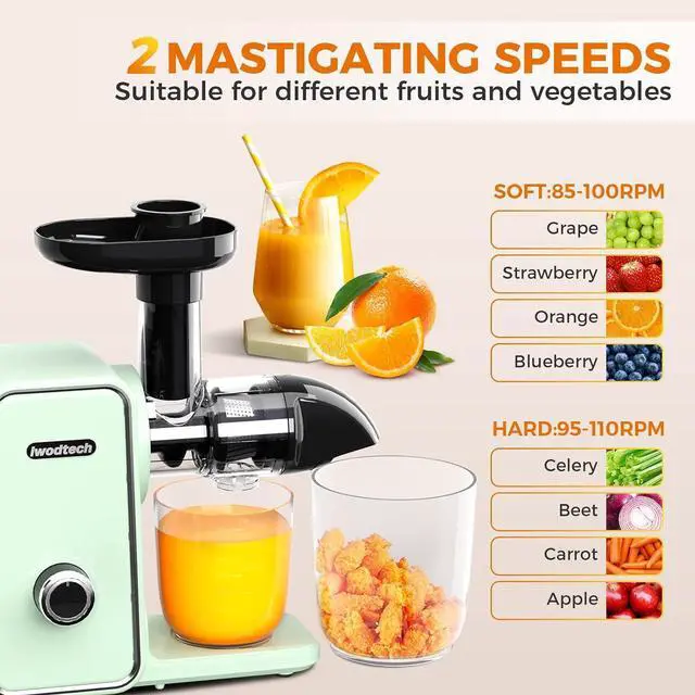 Safe and Quiet Operation: Iwodtech Juice Extractor runs less than 50dB, A Juicer That Lets You Enjoy Bass Running Anytime, Anywhere. Equipped with a intelligent protection chip, the vegetable and fruit juicers machines automatically stops working every 20 minutes to ensure longer service life.