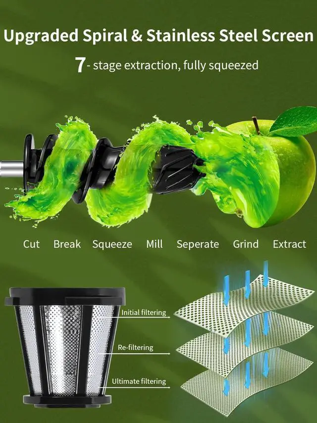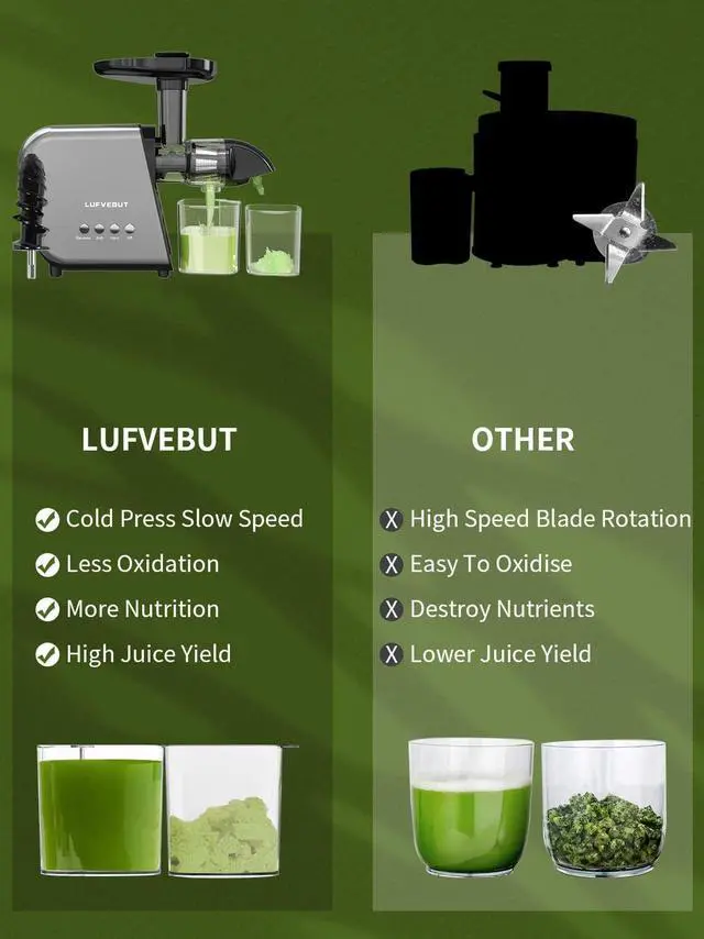 The Most Ideal for Daily JuicingWhether it is for personal health or fresh juice, the LUFVEBUT juicer meets your needs. Unlike centrifugal juicers, the masticating juicers rotates at slow speeds (45-65rpm) and efficient power (250 watts), using 7-segment spiral system and fine filter, it can fully grind fruits and vegetables to extract the most juice while reduct oxidation. Thanks to cold press process, it creates no heat, much quieter. *Retain More Nutrients and Flavors In the Juice.