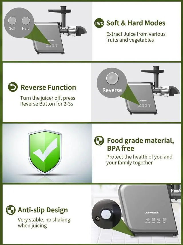 Variable Speed for Juicing VersatilityCompared with manual juicers' limitation in the type and quantity of juice they can produce, the multi-functional juicers can do more. Soft Mode easily extract juice from tomato, watermelon, orange, grape, cucumber and more. Hard Mode easily handles celery, wheatgrass, apple, pomegranate, pear, carrot, beets, ginger, kale and more. Very suitable for weight loss people, children, the elder. *DIY Healthy Juice At Home and Enhance Your Immunity.