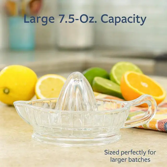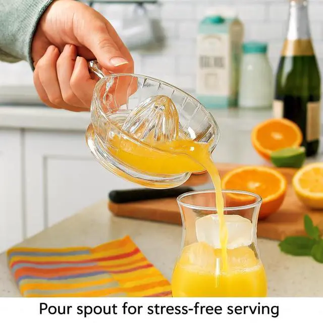 HIC Kitchen Citrus Juicer Reamer With Handle And Pour Spout is a classic manual juicer for quickly and efficiently extracting fresh juice from oranges, lemons, limes, grapefruits, and other citrus fruits. Perfect for everyday kitchen use, this juicer makes it easy to enjoy fresh-squeezed orange juice in the morning, prepare healthy smoothie recipes, or add zest to marinades, sauces, and salad dressings. It is also an essential bar accessory for creating refreshing Arnold Palmers, margaritas, and other craft cocktails. The pointed reamer quickly releases juice while the deep reservoir collects it, and the easy-grip handle and built-in pour spout make serving convenient, mess-free, and stress-free. To use, simply cut citrus in half, place the cut side onto the pointed reamer, and twist back and forth with firm pressure until the juice collects in the reservoir, then pour directly where it is needed. Made from heavyweight glass, it resists damage from the citric acid found naturally in citrus fruit, and its compact size makes it easy to store without taking up counter or cabinet space. Easier and more economical than an electric juicer or blender, this simple manual tool is designed for everyday use in cooking, baking, and entertaining. Cleanup is quick and easy, just hand wash in warm, soapy water. Brought to you by HIC, a third-generation family owned and operated company in the USA since 1957.