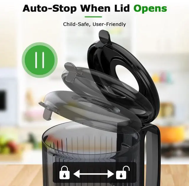 Safe and Easy to OperateLid sensor of OMMO masticating juicer stops in 0.2sec if opened mid-cycle. Safer for curious little helpers wanting to see how it works. And the food-grade spiral auger of the juicer machine makes this safe for families.