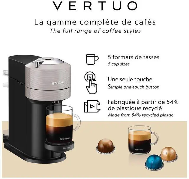 Vertuo Next takes the full range of Nespresso coffee styles even further with five cup sizes available to brew at the touch of a button. With a sleek new design made from 54% recycled plastics, Vertuo Next will fit any kitchen and to go the extra mile, even connects to Wi-Fi and Bluetooth to ensure its software is always up-to-date. Sleek & Modern Design