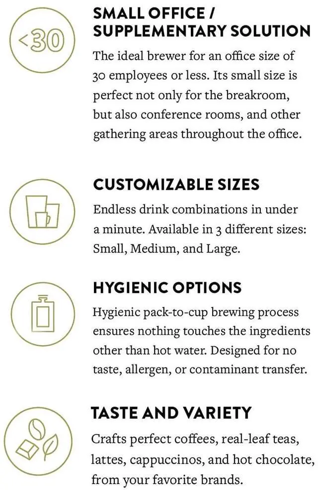 Perfect automatic brewer for an office with 30 employees or fewer. Crafts perfect coffees, lattes, cappuccinos, and hot chocolate from your favorite brands. Designed for no taste, allergen, or contaminant transfer; no mess, no cleanup.