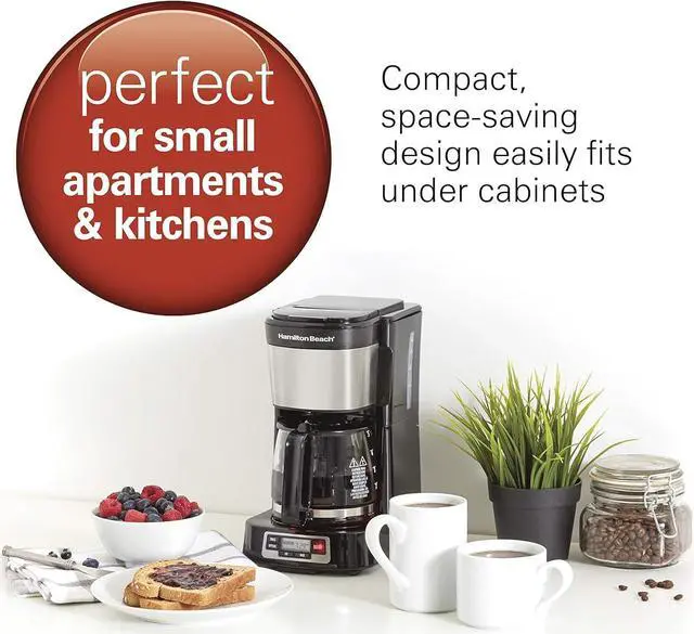 Hamilton Beach 5 Cup Compact Drip Coffee Maker with Programmable Clock, Glass Carafe, Auto Pause and Pour, Black & Stainless Steel (46111)