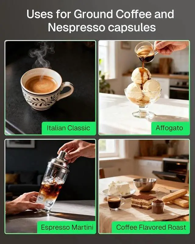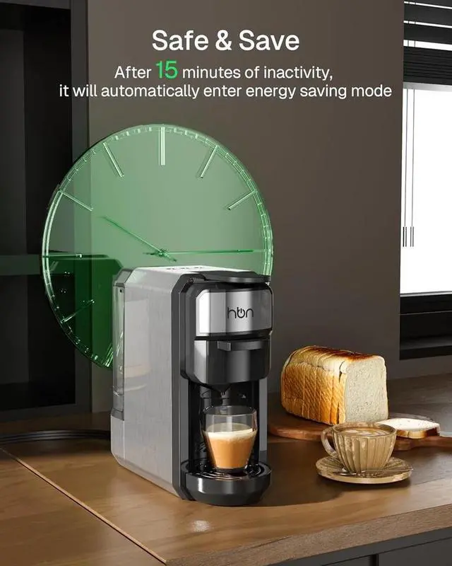 HBN 3-in-1 Multi Coffee Maker Single Serve, for K-Cup Pods & Ground Coffee, Programmable One-Touch Brewing Machine, 0.6L Removable Water Tank, 19Bar, Fast Heat, Energy Saving 1.Power: 100-120V~60Hz,1450W 2.Water capacity: 0.6L 3.Transparent removable water tank4.19 bar pump5.ON/OFF main switch 6. Can manually stop or auto stop7. Patented brewing group & design8. Stand by for 15 minutes9. Indication when ready to brew. 10. Energy saving model according to Erp2. 11. 3 in 1 Compatible Capsules & Coffee poweder & K cup