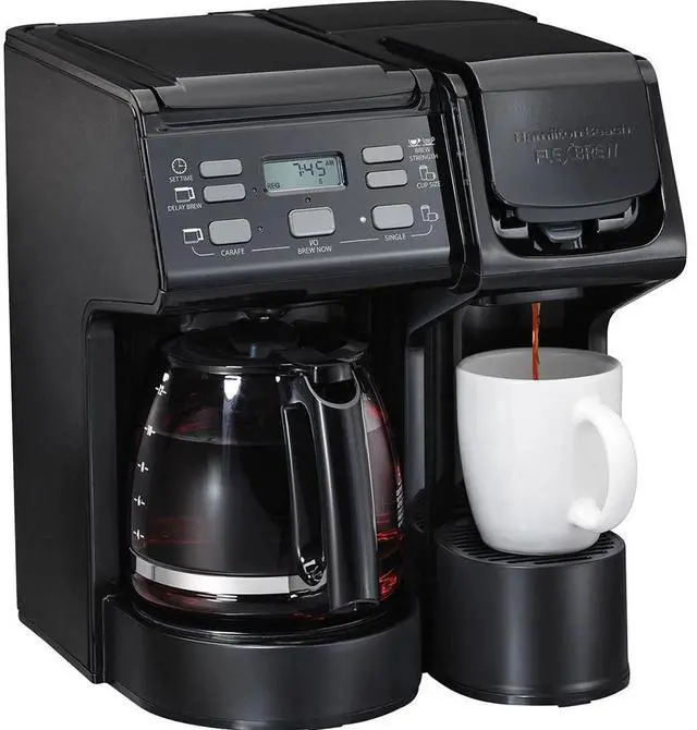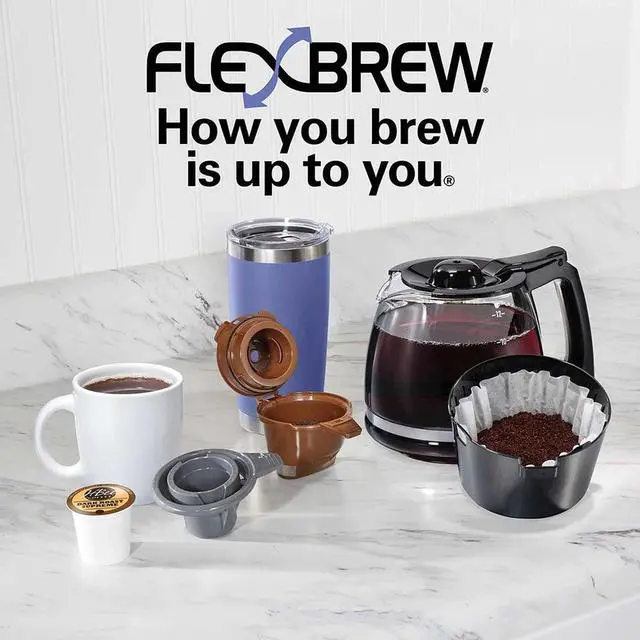 The Hamilton Beach® FlexBrew® Trio Coffee Maker lets you brew 3 ways. On the single-serving side, you'll enjoy fast brewing every morning because it brews a single cup in about 90 seconds. The single-serving side lets you brew multiple cups without refilling the 40 oz. water reservoir and provides multiple brewing options. You can brew a single cup with your favorite brand of pod (such as a K-Cup pod) or brew with ground coffee. Using a pod lets you brew up to 10 oz. of coffee, and brewing with coffee grounds lets you brew up to 14 oz. of coffee into a travel mug. On the carafe side, you can brew up to 12 cups of coffee with your favorite grounds, plus you can set up wake-up ready coffee with Easy-Touch programming and pour yourself a cup before brewing is finished with Auto Pause & Pour. After brewing, coffee stays warm in the carafe for 2 hours, then the power automatically shuts off. No matter how you brew, Select-a-Brew lets you choose bold or regular brewing strengths. Includes a glass carafe, single-serve pod holder, single-serve brew basket and a cup rest with a storage area for either.