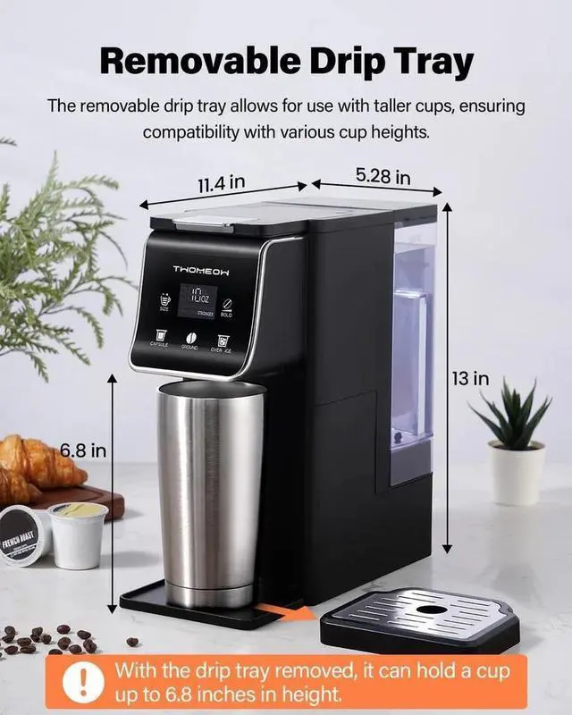 REMOVABLE DRIP TRAY: Accommodates taller cups and travel mugs (up to 6.8 inches), ensuring versatility for all your serving needs.