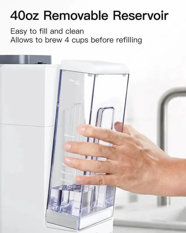 REMOVABLE 40 OZ TANK: Brew 4-5 cups before refilling with the detachable reservoir
