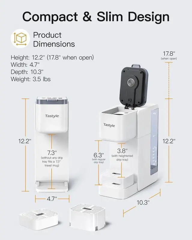 SPLASH-PREVENTING & TRAVEL MUG FRIENDLY: Features a heightened drip tray to prevent coffee splashing due to gravity when dispensing. Accommodates travel mugs up to 7.3 tall after removing drip trays