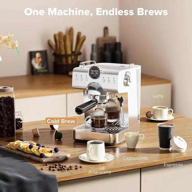 20 Bar Espresso Machine with Cold Brew, Professional Expresso Machines for home, Stainless Steel Espresso Maker with Milk Frother, Auto Sleep Mode, 1.5L Removable Water Tank, for Latte, Cappuccino