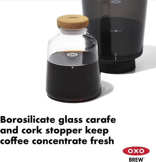 Borosilicate glass carafe and stopper with silicone seal keep coffee concentrate fresh