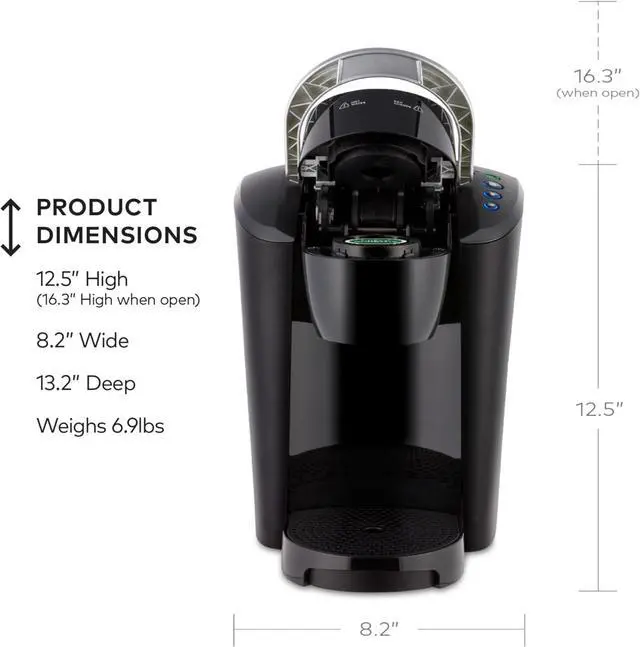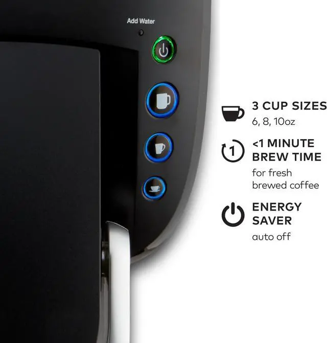 SIMPLE BUTTON CONTROLS: Just insert a pod, select your desired cup brew size, and brew a great-tasting cup in under a minute.