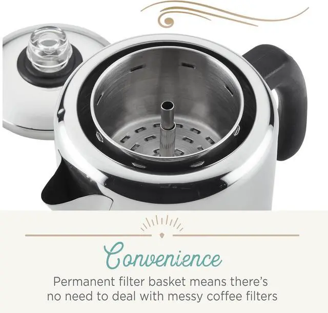 DURABLE AND CONVENIENT: Heavy-duty stainless steel coffee maker is polished to a mirror finish. The sturdy, clear glass knob lets you know when percolating begins