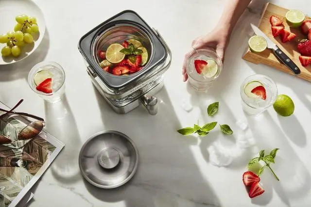 Beautiful, streamlined design with glass and stainless steel components to preserve taste, for easy use and cleaning.