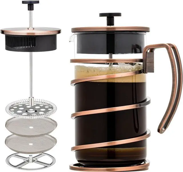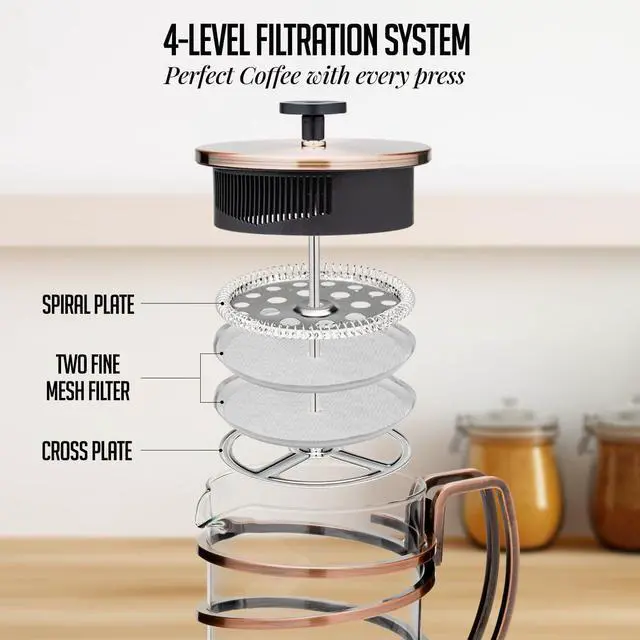 FRESH & AUTHENTIC COFFEE TASTE Featuring a 4-level filtration system, complete with a metal mesh filter, spring disk, metal cross plate and final mesh screen. It effectively filters out coffee grounds while extracting the aromatic oils and subtle flavors. This preserves the natural oils and flavors of the coffee, allowing you to enjoy a rich, pure taste free from sediment and grit.