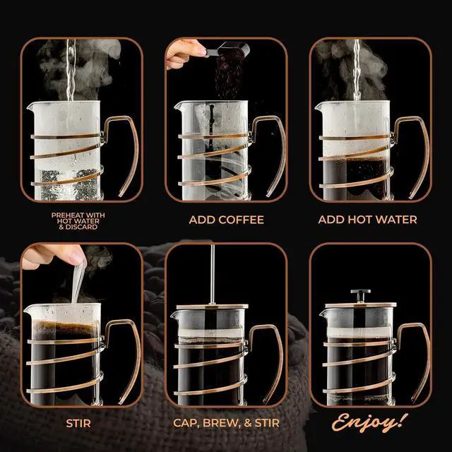 EASY TO USE & CLEAN Brewing homemade coffee is simple, just follow four easy steps; add coarse ground coffee, pour in hot water and stir, wait a few minutes, then press to enjoy a perfectly refined cup of coffee. It also includes a 7-gram measuring spoon to ensure you brew the perfect cup every time. Our glass French press is designed for easy cleaning, with key components, including the plunger and filter, being dishwasher-safe for effortless cleanup.