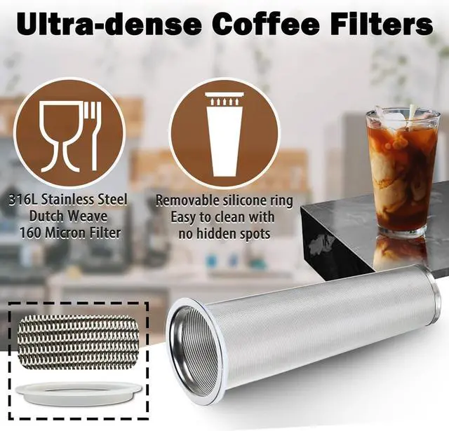 [Super Dense Filter]: Food-grade stainless steel conical filter; 160-micron weave makes the filter taste silkier and retains the aromatic oils in the coffee beans; The conical design makes the maximum area of contact between coffee powder and water, and the silicone ring allows you to shake the mason jar pitcher at will to ensure there is no leakage