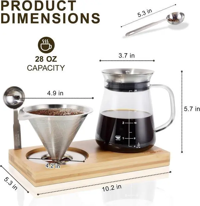 Simplified Steps, Easy to Use - A solid and beautiful bamboo base assists storage whole pour over coffee maker set while avoiding coffee stains on the table. Simplify the steps of preparation and cleaning, and create more enjoyment time