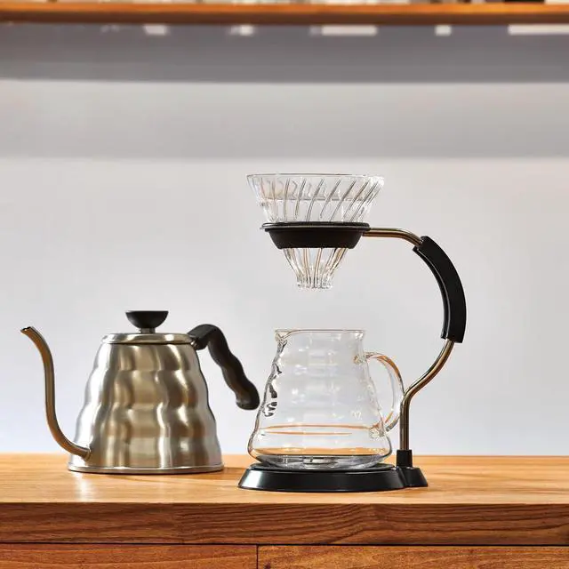 Brews 1-4 cups Comes with a measuring spoon and 40 paper filters Cone shaped coffee dripper, favorite of baristas around the world Extracts more of the coffee flavor Made in Japan Hario V60 Arm Stand with Glass Dripper Set