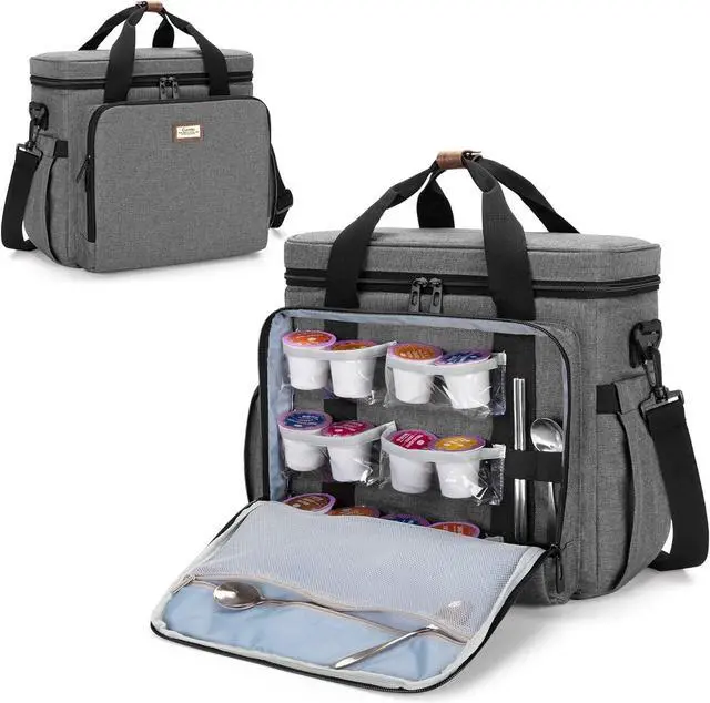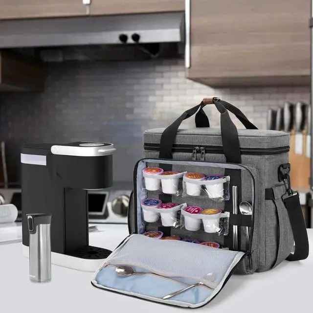 FUNCTIONAL: 2 zipper pockets, 6 transparent pockets and 4 elastic loops for arranging coffee pods, creamers, sugar packets, spoons, stirrers, etc. Side pockets with elastic top for keeping travel mugs or water bottles. Back pocket for other things you need.