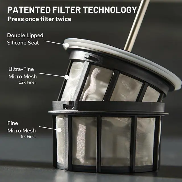 Two Filters Are Better Than One - The patented double micro-mesh filter keeps your cup of coffee free of grit and sludge, ensuring every sip is smooth and delicious; No more unwanted coffee grounds in your cup!