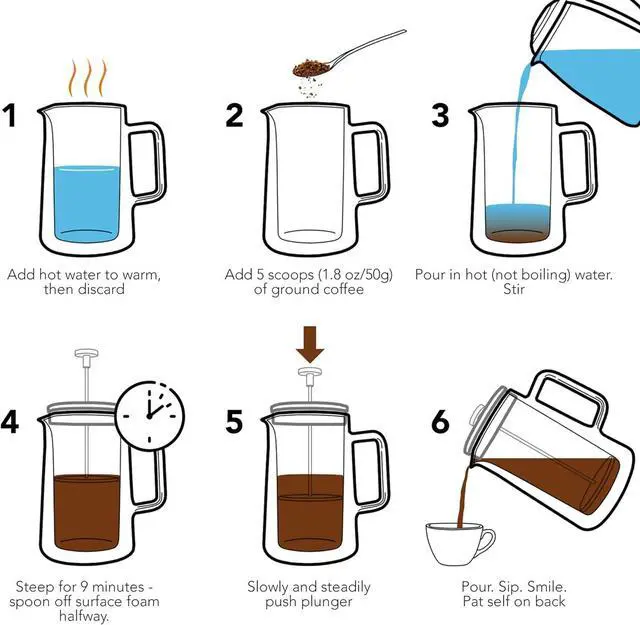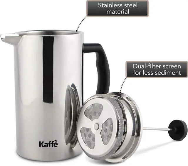 EASY TO USE - Simply remove the lid with the filters and add coarse coffee to the french press coffee maker, add hot water, brew for 9 minutes, and press with the lid on. Done! Home made french press coffee in under 10 minutes!