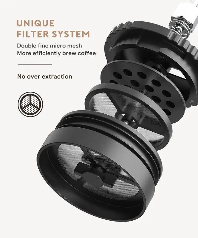 Portable French Press: Food Grade stainless steel material keeps original liquid flavors, with double vacuum insulation, ground coffee full immersion and make great flavor, but never over-brew, no over extraction.