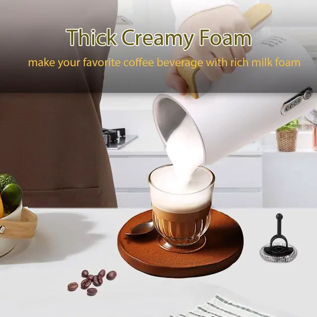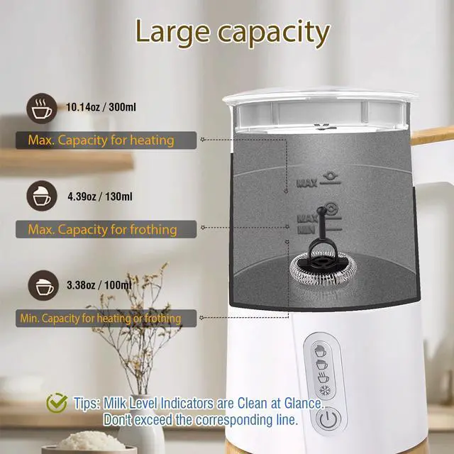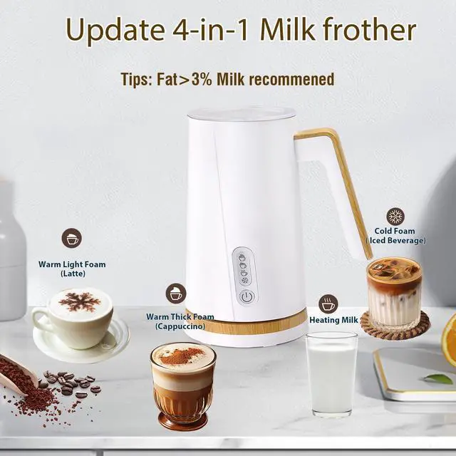 Updated 4-in-1 Electric Milk Frother The NESSGRAIM electric milk frother offers 4 functions in one device: dense hot foam, airy hot foam, cold foam, and a milk warmer without foam. Perfect for making your favorite coffee specialties like cappuccino, latte macchiato, or just hot milk at home. The stylish vintage wood handle complements any modern or classic kitchen decor. Large Capacity for Multiple Servings With a capacity of 130 ml for froth and 300 ml for milk warming, you can prepare several cups for your family or guests at once. The electric milk frother is excellent for a variety of coffees and teas, making it ideal for professional coffee enjoyment at home. Tip: Use milk with up to 3% fat content for the best froth. Easy to Use & Quiet Operation Simply press the power button to select your preferred mode. PLEASE NOTE: The top 4 are mode indicator lights that do not have touch functionality, and the indicator light will turn on to show that the mode is working. Our sleek milk frother is so quiet that no one will hear you make a delicious cappuccino in less than 1-2 minutes. The electric milk frother automatically shuts off once it's done. Easy to Clean The milk frother features a scratch-resistant, non-stick surface that makes cleaning a breeze. Simply rinse it under running water and wipe it dry with a soft cloth. A cleaning brush is also included to remove stubborn residues. Tip: Avoid flooding the base directly with water to maintain the milk frother in perfect condition. Safety with Temperature Control With a rated voltage of 120V, the electric milk frother is particularly safe to use. The milk warmer heats the milk to an optimal temperature of 65°C ±5°C (149°F ±41°F), ensuring a perfect cup of coffee. Important note: It is recommended not to set the temperature higher, as this may negatively affect the taste. But it is not recommended to be hotter than this, as it will affect the taste.