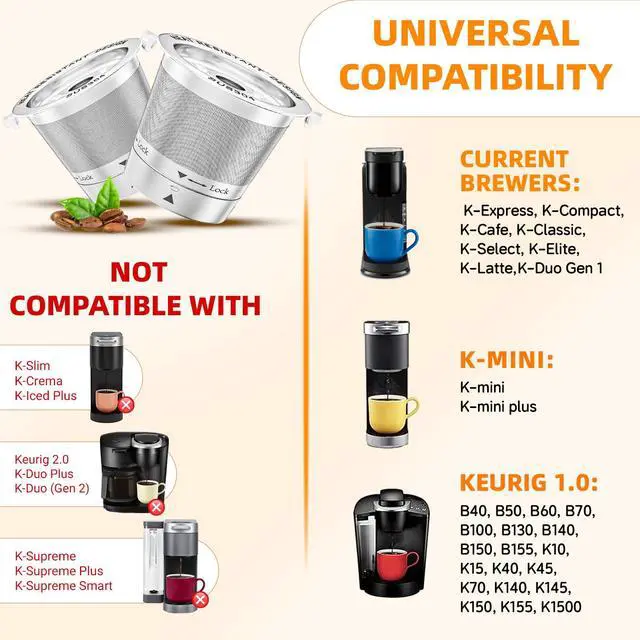 Check Before Buying: Only for Keurig 1.0 & 1 Prong machines. NOT compatible with Keurig 2.0, K-Supreme, K-Slim, K-Duo Hot & Iced and paper filter