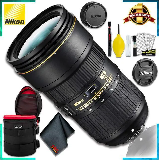 • F-Mount Lens/FX Format | Aperture Range: f/2.8 to f/24. ASP/ED, AS, ED, and HRI Elements | Nano Crystal & Super Integrated Coating. Fluorine Coated Front and Rear Elements | Silent Wave Motor AF System. Vibration Reduction Image Stabilization | Internal Focus, Manual Focus Override. 1 x Nikon AF-S NIKKOR 24-70mm f/2.8E ED VR| 1 x 8 Inch Vivitar Premium Lens Case | 1 x 1 Year Extended Warranty | 1 x Cleaning Kit