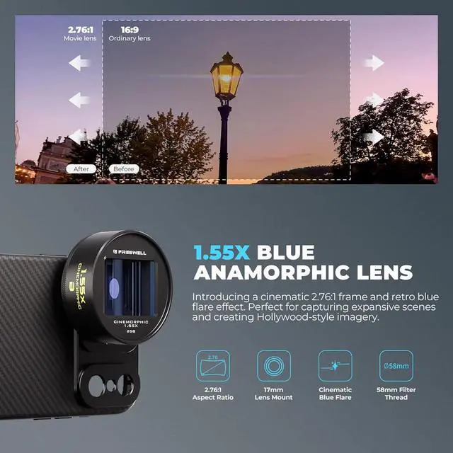 Designed for smartphone compatibility, the Freewell 1.55x Blue Anamorphic Lens is optimized for use with iPhone, Samsung, and any other smartphones equipped with a 17mm threaded mount. This lens is crafted to elevate mobile videography to a professional level, making it an indispensable addition to any filmmaker's toolkit.