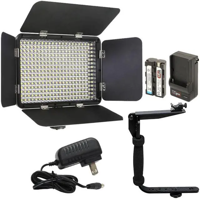 Featuring 330 LEDs, the LED-330X Variable-Color On-Camera LED Video Light from Vidpro produces a 180W equivalent, 70 degrees light beam while maintaining a slim, lightweight, and portable design. It features variable color temperature between tungsten-balanced 3200K and daylight-balanced 5600K, and a stepless dimmer that lets you adjust the light output from 100% down to 10%. Integrated barn doors allow you to control light spill, limit light leaks from the edges, and provide directionality to your light. For power, the LED-300X accepts a single Sony L-series (NP-F) type battery, and a FP-F550 type battery and charger are included as part of this lighting kit.