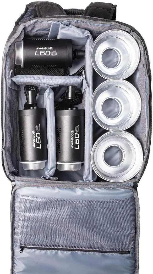 Equipped with a large, central storage compartment featuring removable dividers, the included backpack is ideal for traveling comfortably with your lighting kit. The Lite Traveler Backpack features various zippered compartments for storing smaller accessories, like USB tethering cables, batteries, charging cables, lens filters, and more. A separate internal compartment is equipped with three padded sleeves for storing a laptop and tablet, a convenient water bottle pouch, a tripod holder with retention straps, and more.