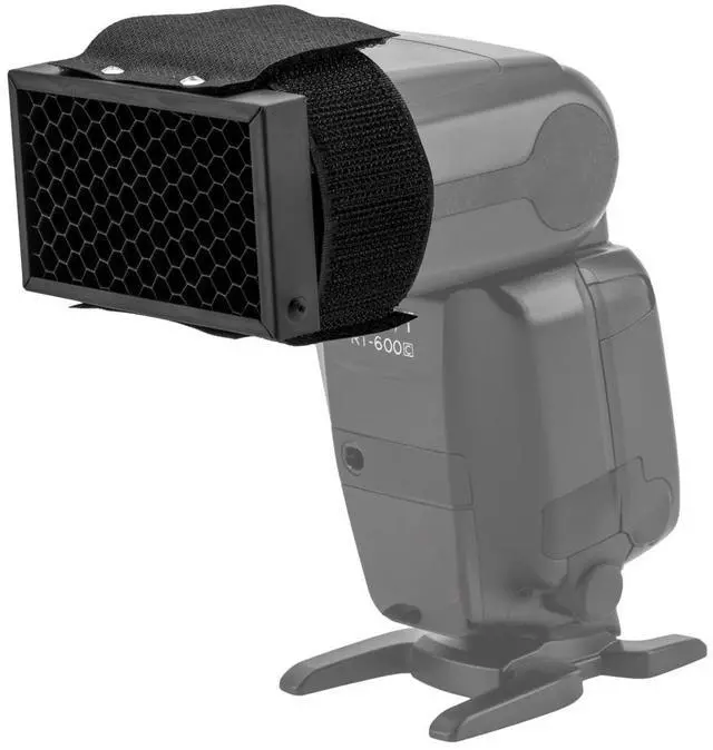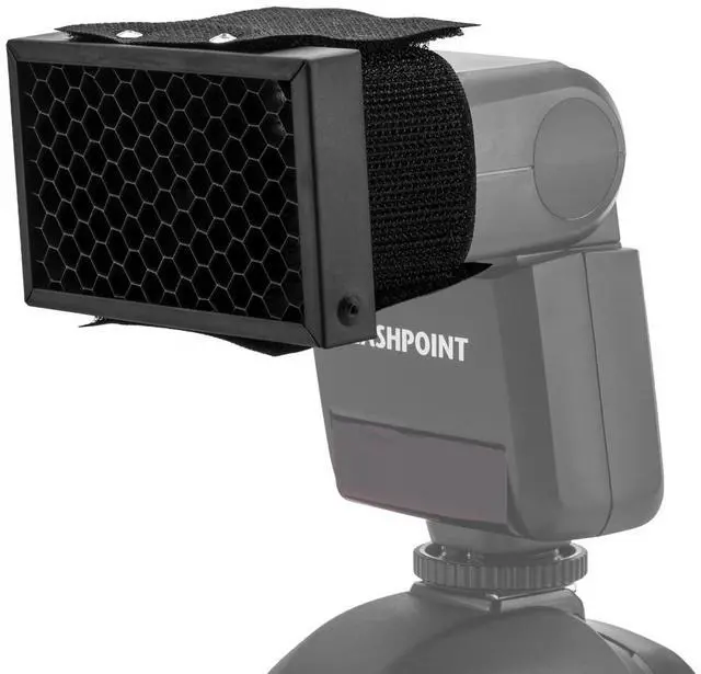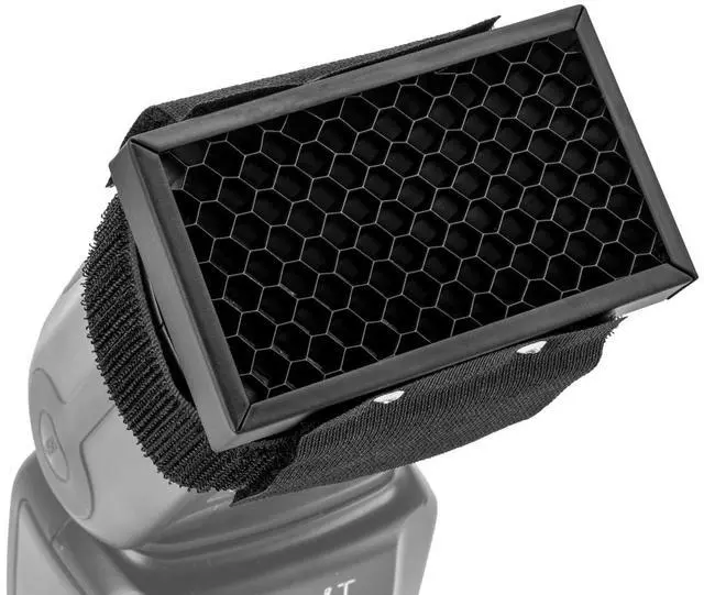 The Flashpoint Honeycomb Grid for Speedlights assemble simply fastens to any rectangular flashhead onto the outer perimeter for a secure perfect fit, kept firmly in position with a Velcro tab and band.