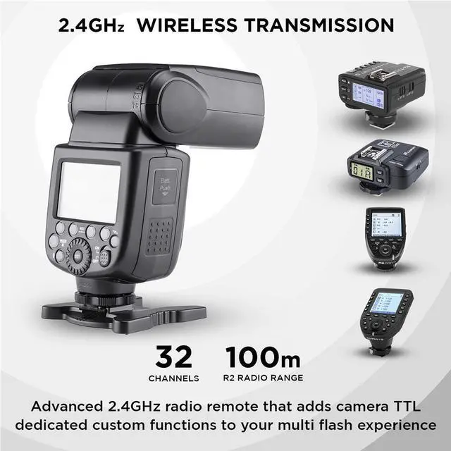 Easy to use buttons command a full range of functions like reliable channel triggering, group mode selectivity, HSS, with powerful signal strength and exceptional stability to your selected camera flash language. The LCD panel clearly display the status of all remote R2 compliant strobes so you always have control of group lighting setup. R2 wireless communication gives speed of light response to on camera or off camera R2 family devices for a spectacular advantage on the shoot in any environment. The other massive advantage is the internal and interchangeable Lithium Ion Polymer battery with exponentially more power than AA batteries of any type, while fitting into roughly the same amount of space.