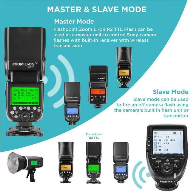 The Flashpoint Zoom Li-on R2 TTL Flash for Sony V2 represents a significant breakthrough in speedlight power technology with the introduction of full R2 Remote TTL connectivity and interaction with all Nikon strobe functions. From standard TTL, to Exposure Compensation (FEC), FV Lock, High Speed Sync, and an automatically zooming flashhead, all the way to complete TTL control connectivity with other Sony flashes, group control, Slave and Master options, and advanced flash functions, the Zoom Li-on flash takes you as far as you want to go. The R2 TTL Wireless Flash System is the advanced 2.4GH z radio remote that adds camera TTL dedicated custom functions to your multi flash experience.