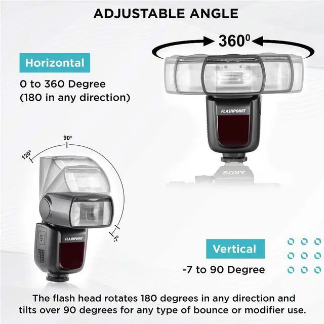 Remote power control using a Flashpoint R2 System Transmitter or R2 Family flash allows you to view and change your flash output as you shoot as well as trigger the flash and adjust other functions from more than 150 feet away, for extreme off camera work. The simple layout and familiar controls make using this flash intuitive. The flashhead rotates 180 degrees in any direction and tilts over 90 degrees for any type of bounce or modifier use
