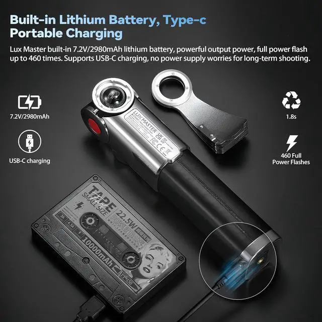 - With its built-in 7.2V 2980mAh lithium battery, Lux Master camera flash delivers strong power output, offering up to 460 full-power flashes. Recharging is quick and easy with the USB-C port, with a charging time of approximately 2 hours.