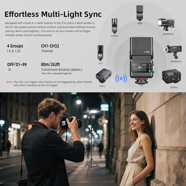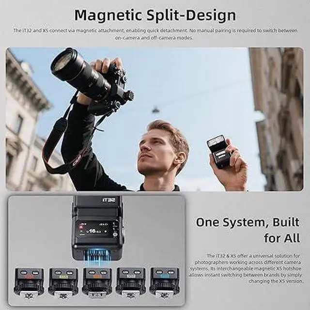 MAGNETIC MODULAR DESIGN - ONE FLASH FOR ALL: The powerful magnetic connection snaps iT32 to X5-C instantly. Swap X5 trigger versions (Sony, Nikon, etc.) to use this flash across camera brandssave hundreds on extra flashes!