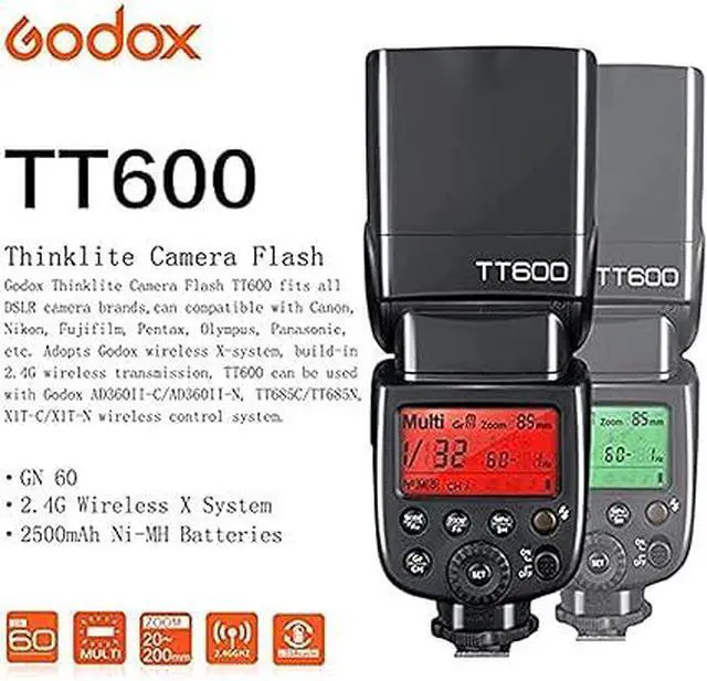 Godox TT600 flash Speedlite adopts Godox wireless X system with built-in 2.4G wireless transmission, TT600 is compatible Godox AD360II-C/AD360II-N flash Speedlite , TT685C TT685N flash Speedlite, X1T-C/X1T-N /Xpro-c/Xpro-N /X2T-C/X2T-N wireless Transmitter trigger and other devices that with wireless control system.