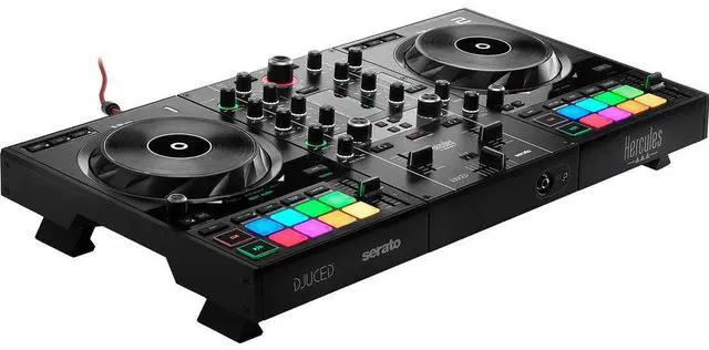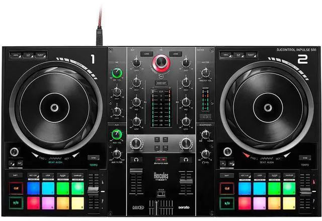 Hercules DJControl Inpulse 500 is a plug-and-play, USB DJ controller that connects in seconds and allows you to mix and scratch with ease using the included DJUCED and Serato DJ Lite software. It offers two-channel mixing with 5.5" high-precision touch-reactive platters, each with a beatmatch light guide for easy manual mixing. The two sets of eight performance pads per channel offer vinyl functions and loop-in / loop-out capabilities, as well as the default color of each cue point in Serato DJ Lite, providing a natural and intuitive control of the cue points and sampler. The Filter/FX area helps create smoother original transitions for professional sounding blends. The built-in Velvet Edge sound card delivers high-quality audio. The controller offers master outputs via dual 1/4" and dual RCA, as well as 1/4" and 3.5mm headphone outputs. Built-in stereo TRS 3.5mm and dual RCA aux inputs feature dedicated volume and filter control knobs for routing external signals through the Inpulse 500 controller. Also included, a balanced 1/4" microphone input with a dedicated volume control and High/Low EQ controls, which remain operational even when disconnected to the computer.The enclosure features a sturdy metal backing plate on the mixer and includes retractable/extendable feet to lift the controller and keep it safe from spilled drinks. The DJControl Inpulse ships with a braided USB cable. Bundle with Hercules Premium Travel Bag for DJControl Inpulse 500 Controller, Hercules HDP DJ45 Closed-Back, Over-Ear DJ Headphones
