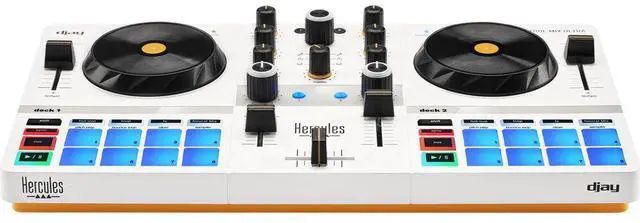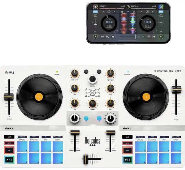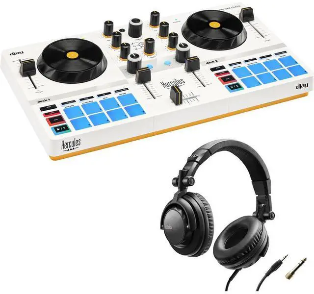 Hercules DJControl Mix Ultra, a compact DJ controller that allows you to mix anywhere on your smart device (Android and iOS) with the included djay app from Algoriddim. The controller features a rechargeable battery with up to 10 hours of playtime, so you're good for long sessions in the wild. Access millions of tracks wirelessly via streaming using the djay app for a vast selection of music at your fingertips. The built-in cover protects the faders and knobs during transport and also doubles as a device stand. Each deck of this 2-channel controller features a 3-band EQ, filter knob, and volume fader, as well as a jog wheel and pitch fader. The crossfader allows you to blend two tracks for smooth transitions. The DJControl Mix Ultra ships with a USB power cable and a DJ splitter cable, which allows you to monitor the headphone output independently from the main outputs. Bundle with Hercules HDP DJ45 are a pair of over-ear closed-back headphones designed for DJs. Their 50mm drivers deliver a 20 Hz to 20 kHz frequency response. The headphones operate at an impedance of 60 ohms, so they will work with most audio sources.