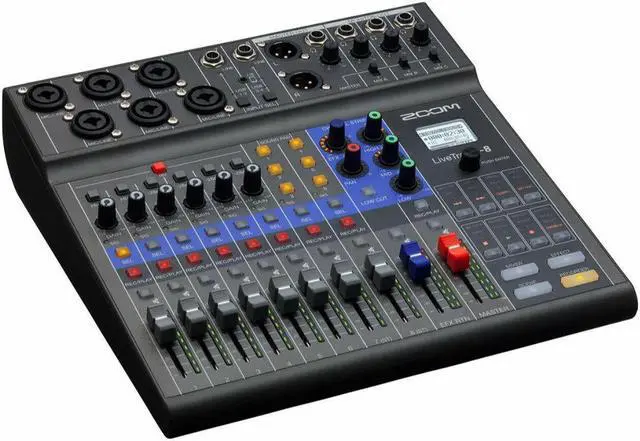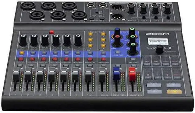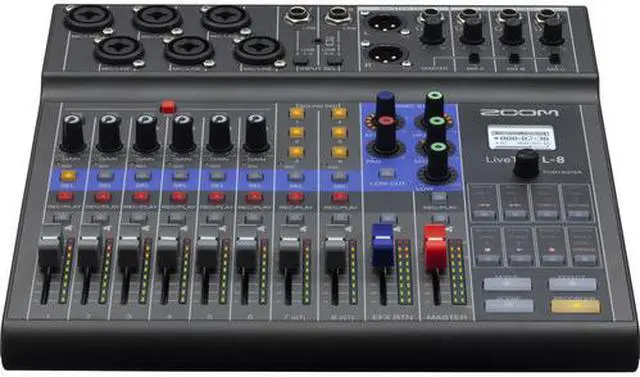 The Zoom LiveTrak L-8 digital mixer and recorder puts the flexibility of Zoom's popular LiveTrak L-Series range in a compact and portable format that's optimized for podcasting and music production on the go. The LiveTrak L-8 provides tactile controls and intuitive functionality, so you can start a podcasting or music recording session in minutes. With six mic preamps, four independent headphone outputs, a phone tap for call-in interviews, and six sound pads, the LiveTrak L-8 can easily handle roundtable podcasts or tracking multiple musicians. Since it can be operated on AA batteries or a USB power supply, it can join you no matter where you go to record.