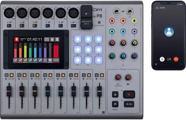 Purpose-built for recording, editing, and producing polished multi-person podcasts anywhere you go without the need for a computer, the Zoom PodTrak P8 Bundle is a portable multitrack podcast recorder that lets you quickly record up to six mics, handle 2 echo-free remote call-ins simultaneously, trigger sound samples, and provide separate headphone feeds for all your guests, all at the same time and with refreshing simplicity, thanks to the large full-color LCD touchscreen. From the intuitive, tactile controls to the powerful audio processing and editing functions, the PodTrak P8 is well equipped to help you record, stream, and export pristine audio for complex panel podcasts.